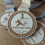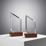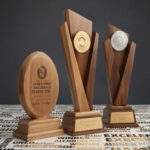 A 4K ultra-realistic studio product shot of four premium awards and trophies arranged side by side on a dark matte surface with a smooth gradient black background. The designs include a modern gold metal trophy with a spherical top and curved supports, elegant wooden and acrylic combination awards with geometric shapes and engraved details, and a clear crystal glass plaque with beveled edges. Materials include walnut wood, brushed gold metal, frosted and transparent acrylic, and polished crystal. Soft cinematic lighting with subtle reflections and highlights enhances textures and depth. Clean composition, professional commercial photography style, shallow depth of field, high contrast, luxury aesthetic, CNC-manufacturable design, sharp edges, vector-friendly engraving areas, no clutter, perfect symmetry, premium award catalog look.